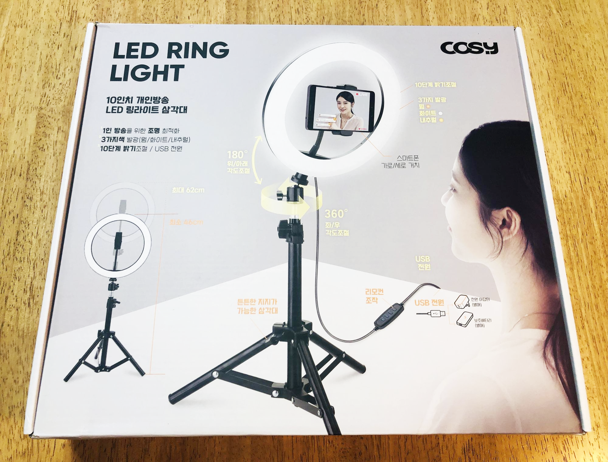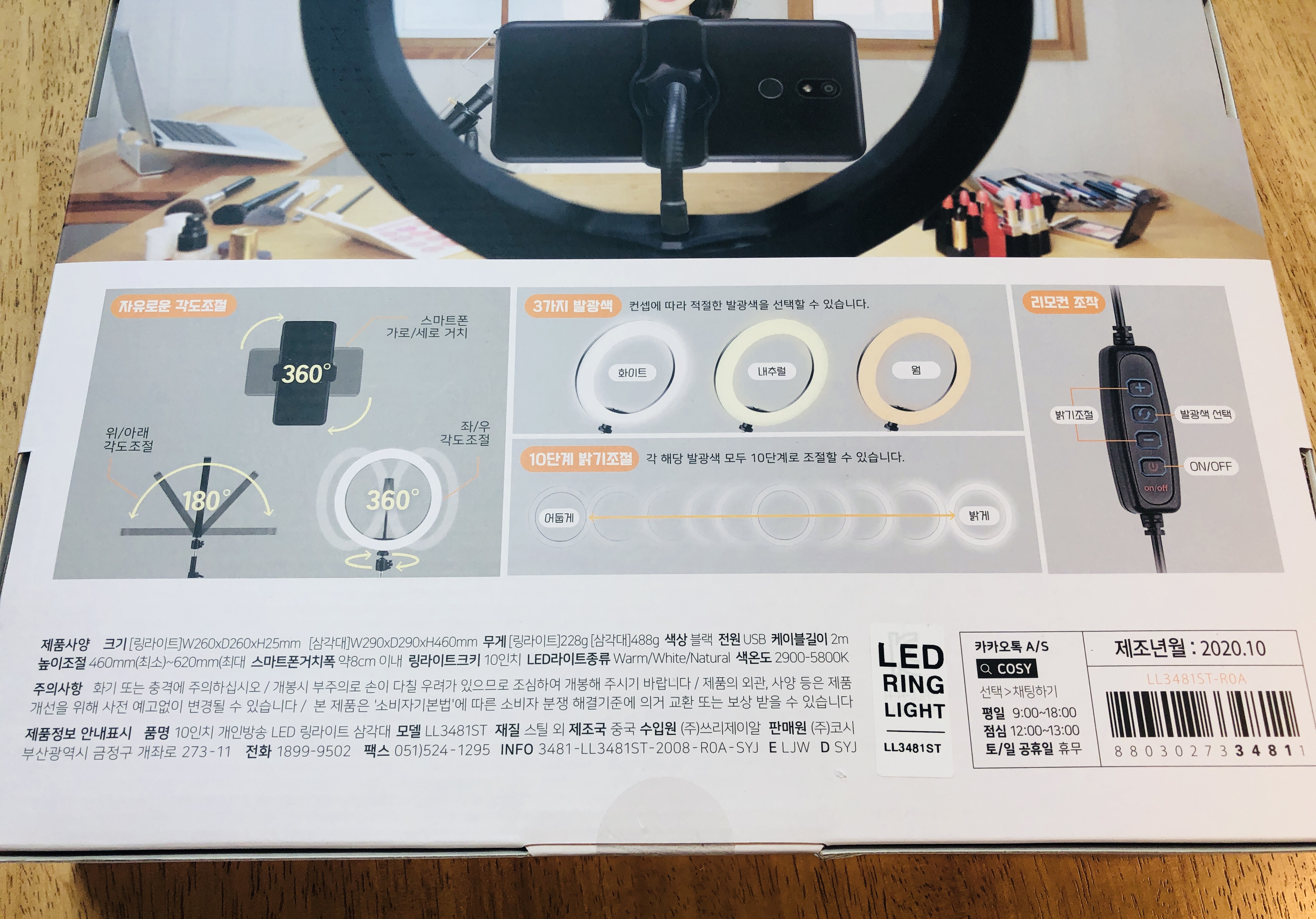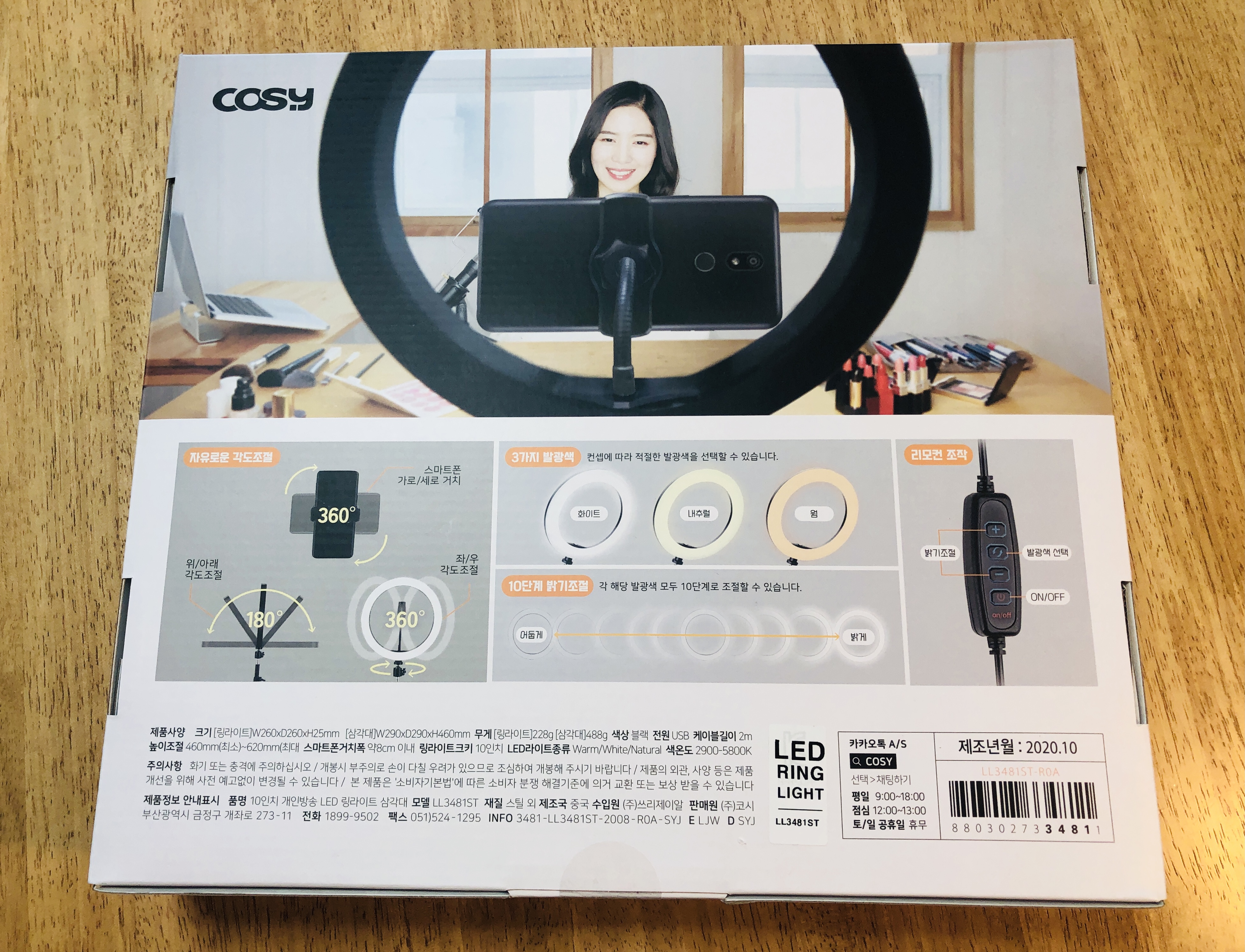 온라인 강의나 회의 때 쓰려고 구입한 코시(COSY) 10인치 개인방송 LED 링라이트 삼각대. 적당한 가격대에 3가지색 발광(웜/화이트/내추럴)과 10단계 밝기 조절이 가능하다.
