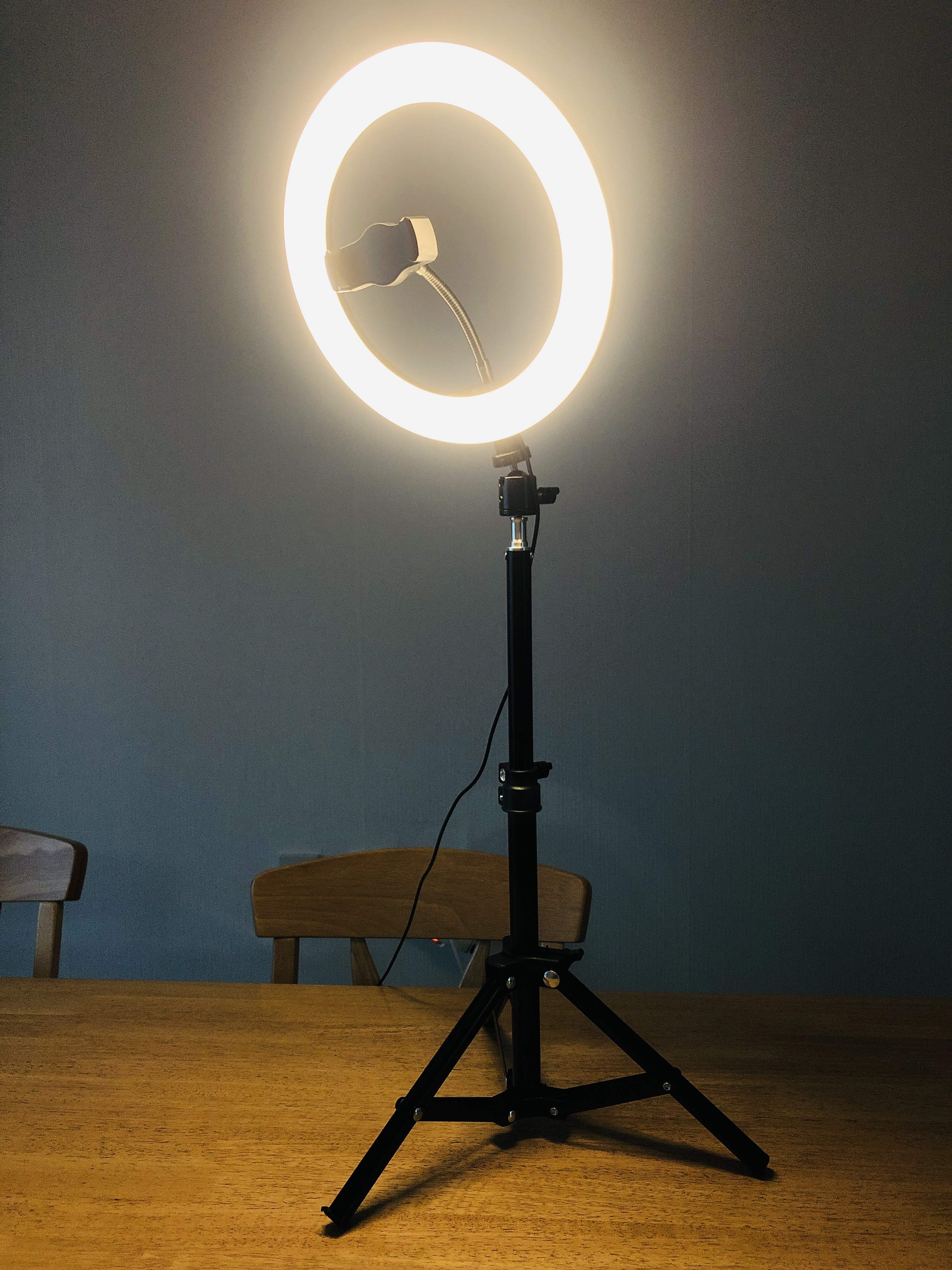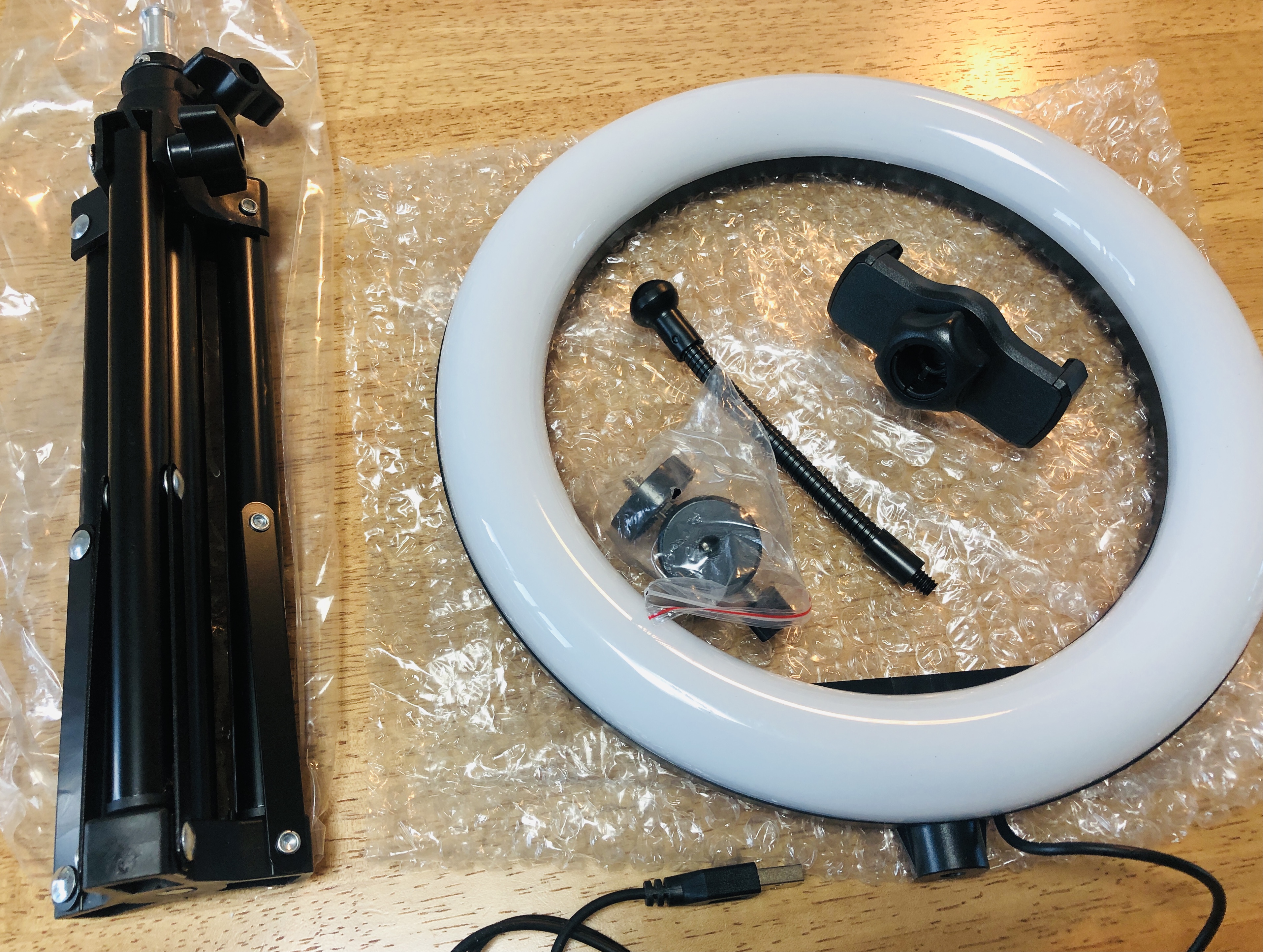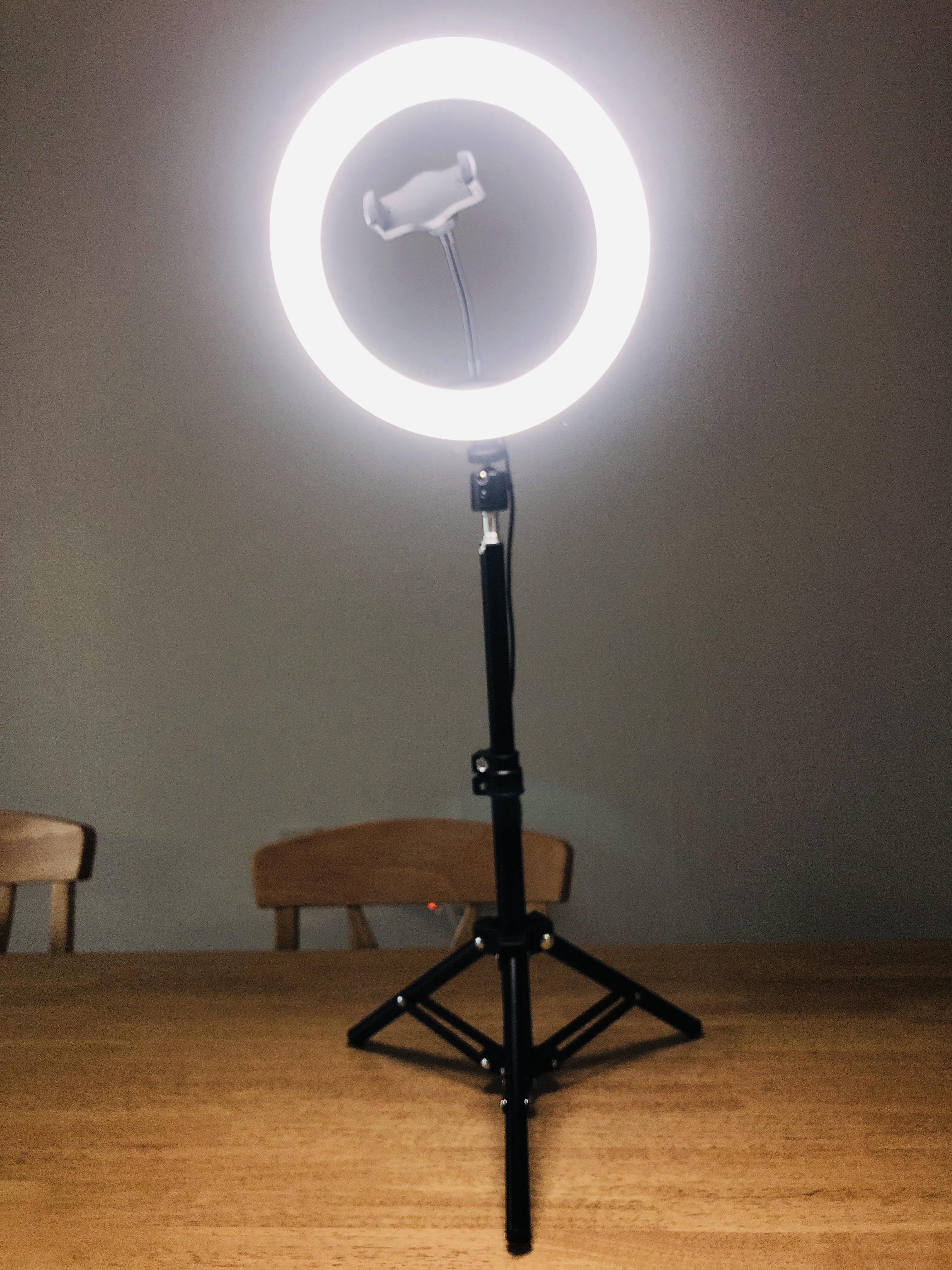 온라인 강의나 회의 때 쓰려고 구입한 코시(COSY) 10인치 개인방송 LED 링라이트 삼각대. 적당한 가격대에 3가지색 발광(웜/화이트/내추럴)과 10단계 밝기 조절이 가능하다.