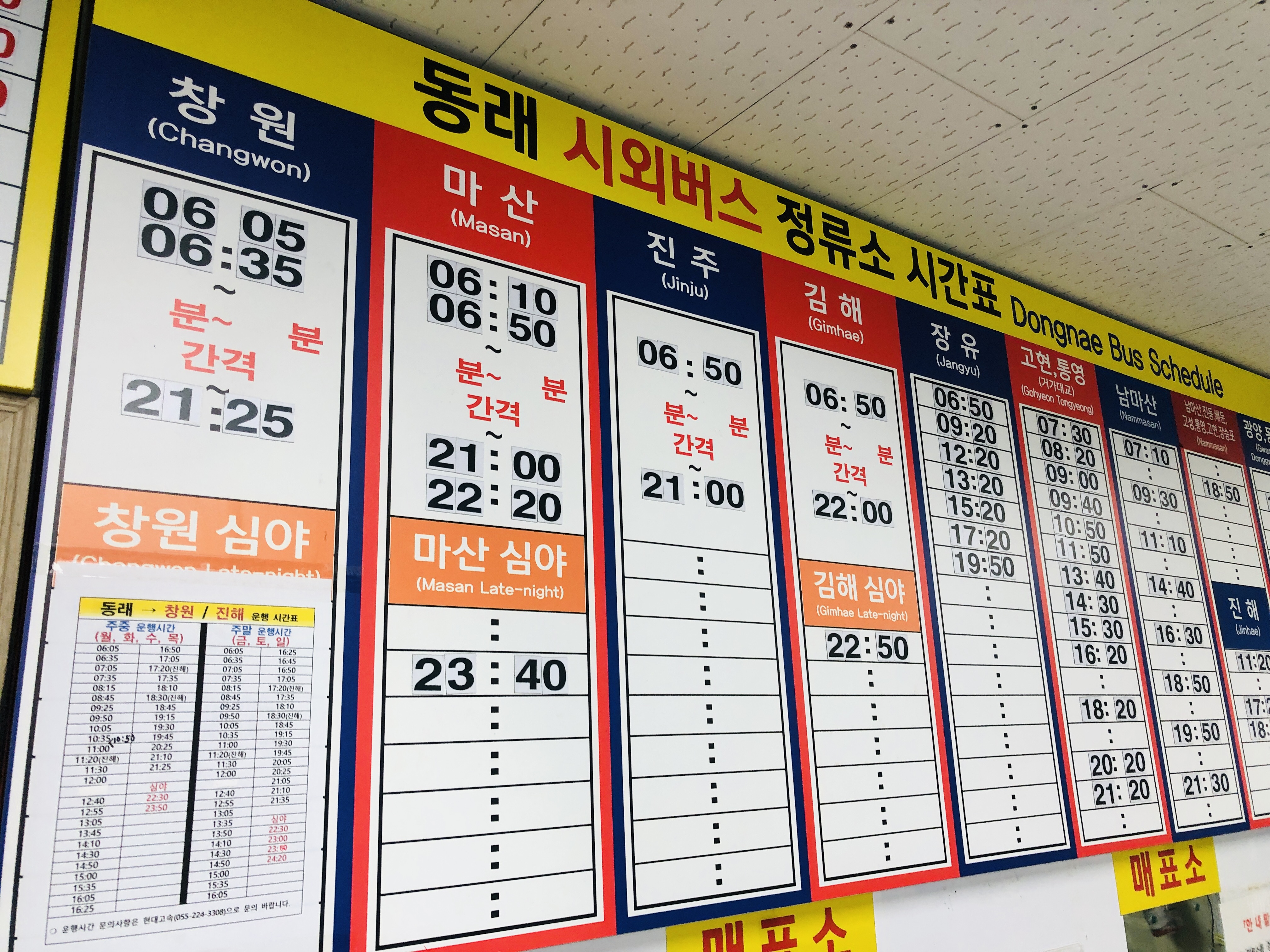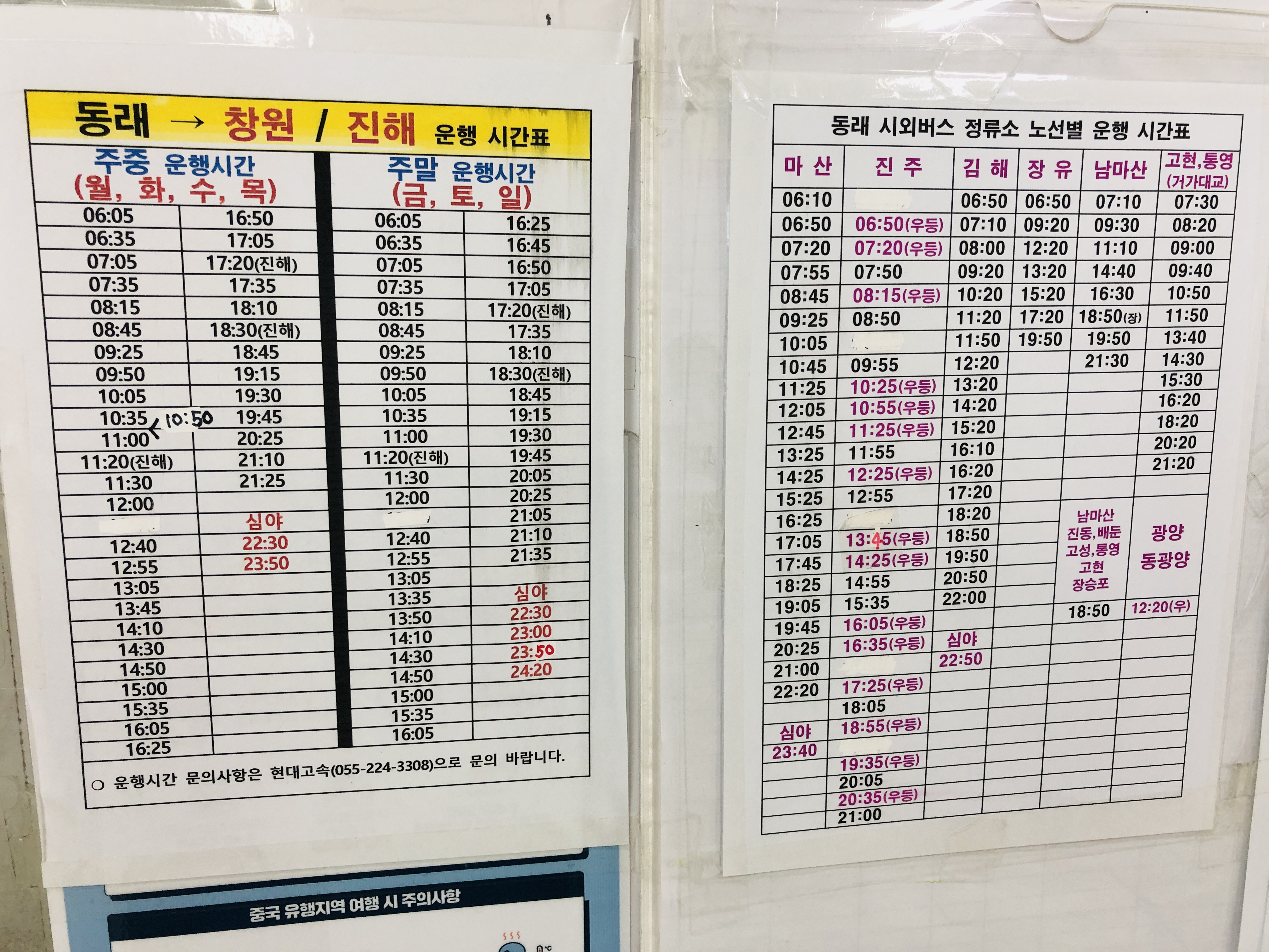 요즘은 앱이나 홈페이지를 통해 시외버스 운행 일정을 손쉽게 알 수 있는데 동래 시외버스 정류소는 그냥 시간표를 꺼내보는 게 빠를듯하여 사진을 찍어서 남겨본다.