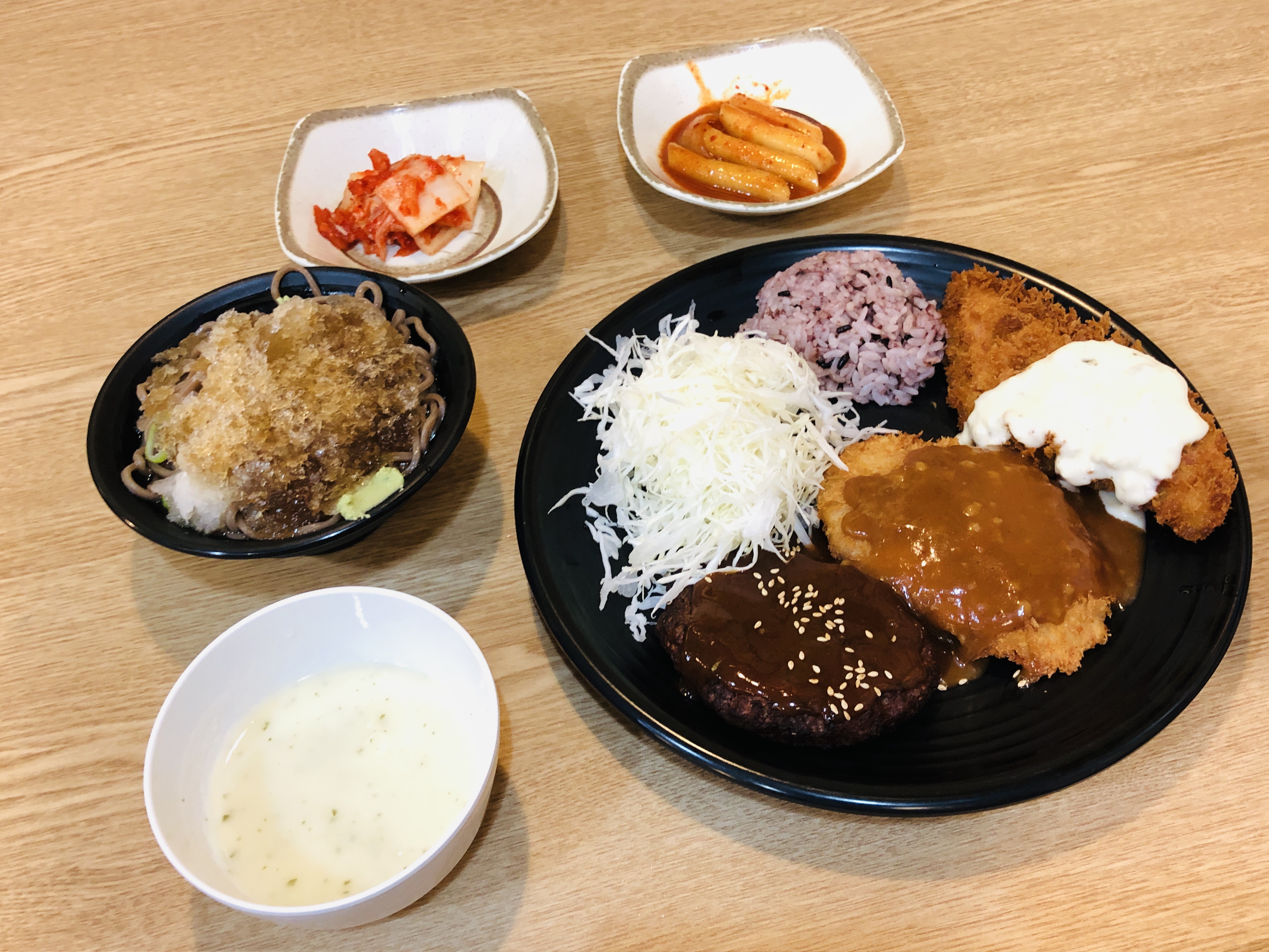 워낙 돈까스나 튀김류를 좋아해서 다 맛있어 보였다. 그래서 한 번에 많이 먹을 수 있는 뢰벤정식과 메밀국수 주문. 뢰벤정식은 돈까스, 함박스테이크, 생선까스 조합인데 1만원이면 가성비 높은 편. 맛은 과연?