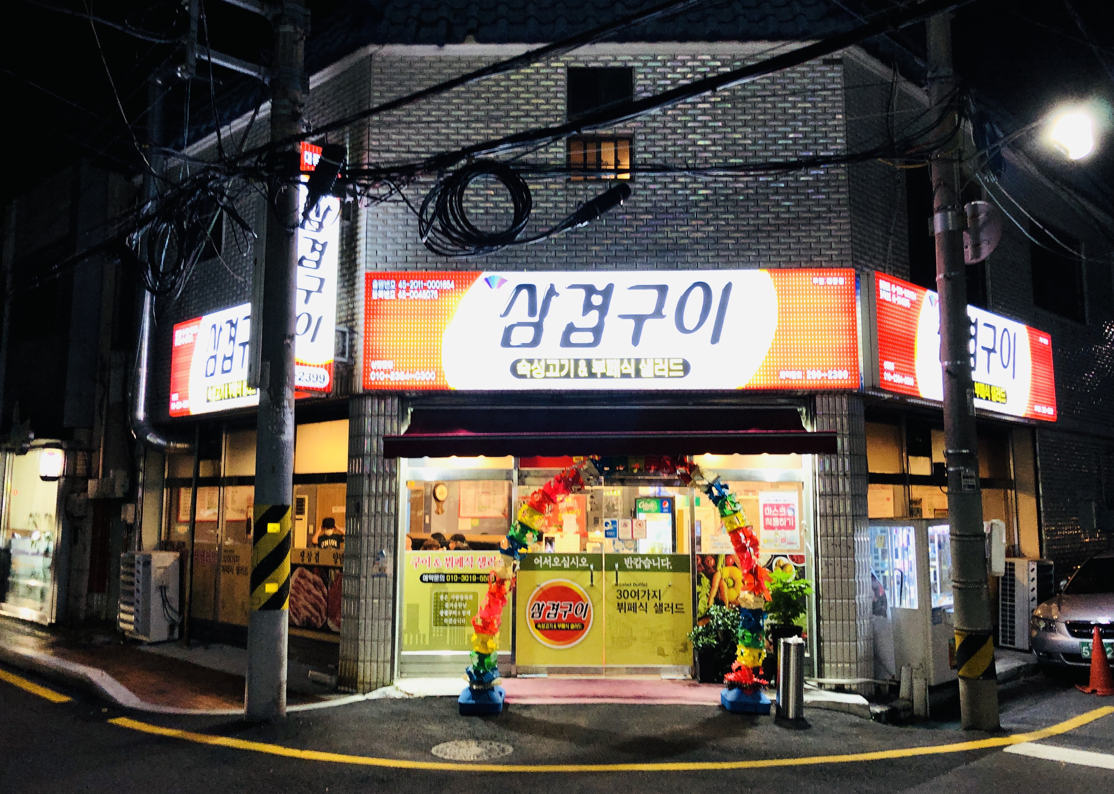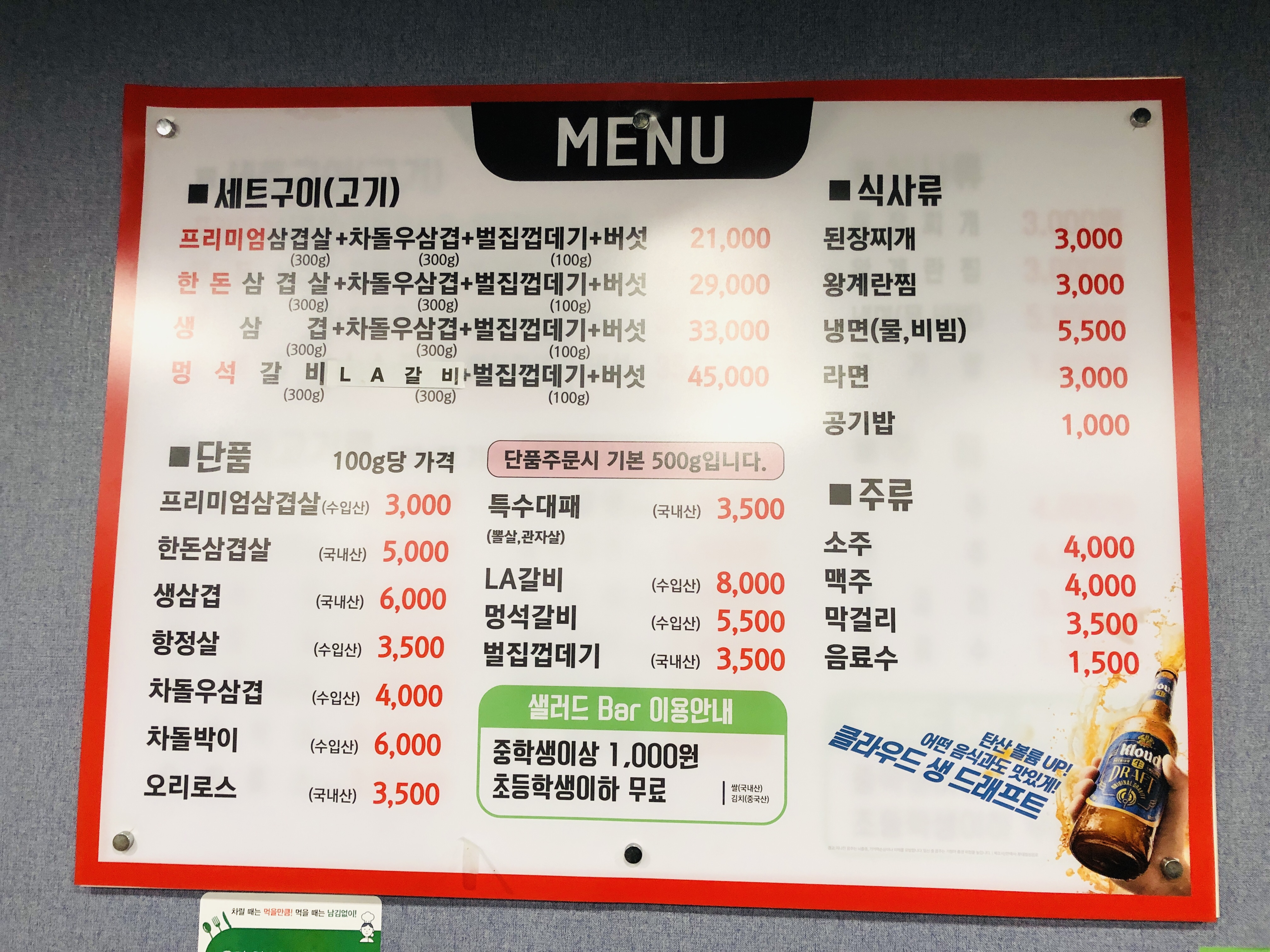 삼겹구이의 매력인 샐러드 뷔페. 고기 구울 때 두부, 어묵, 소세지, 팽이버섯 등을 취향따라 자유롭게 곁들일 수 있어서 좋다. 양배추랑 마카로니 샐러드도 너무 좋다.