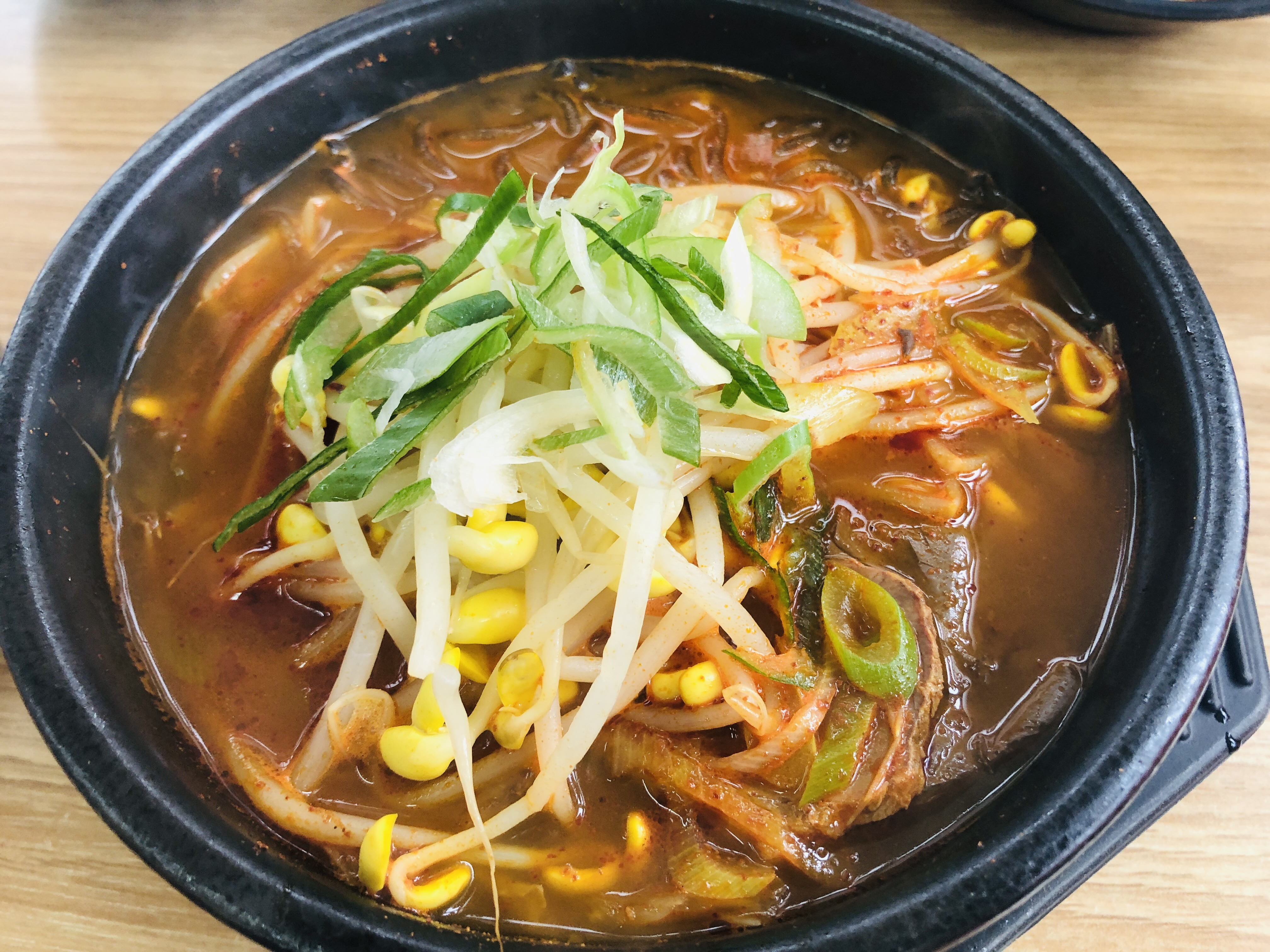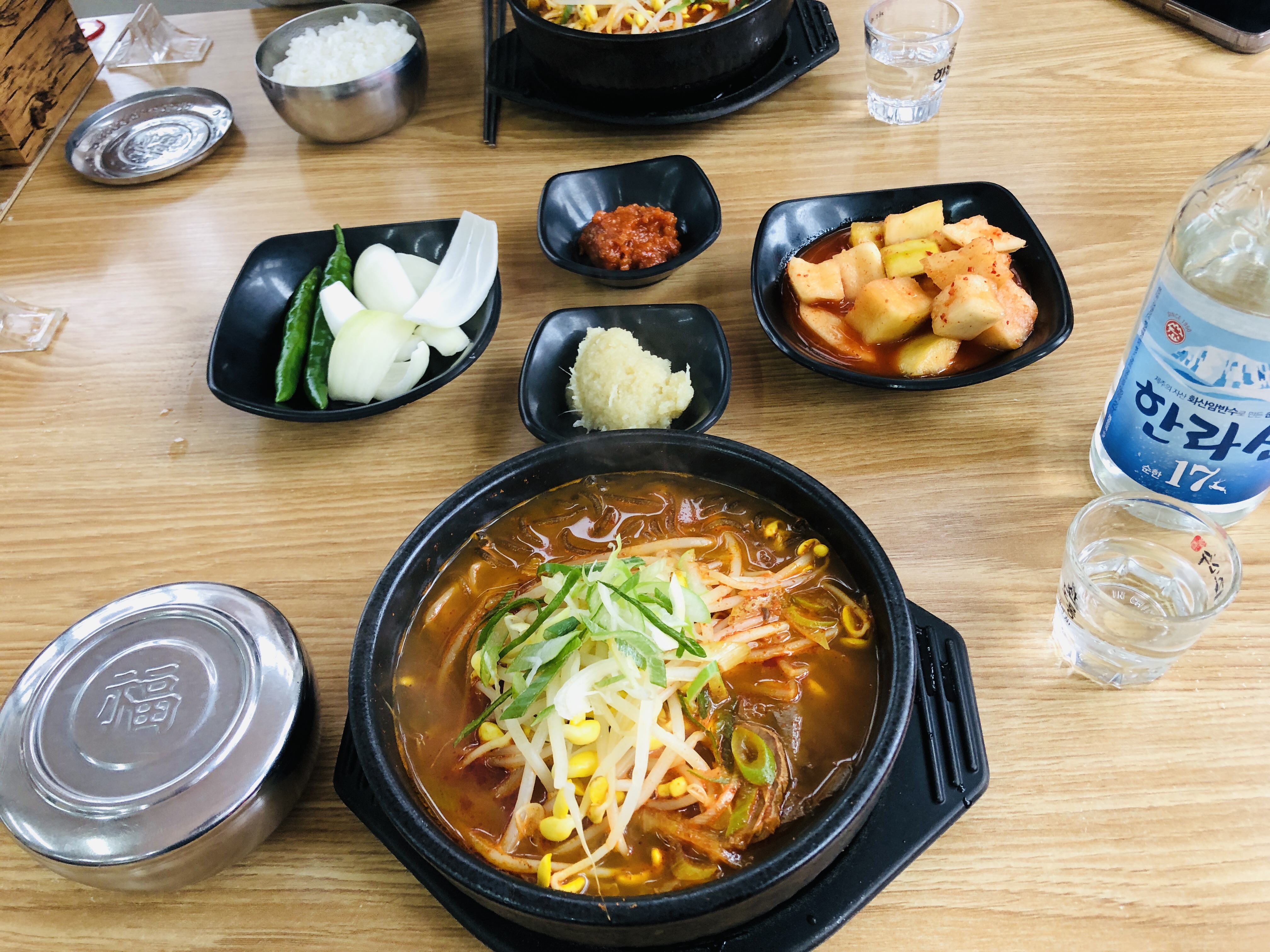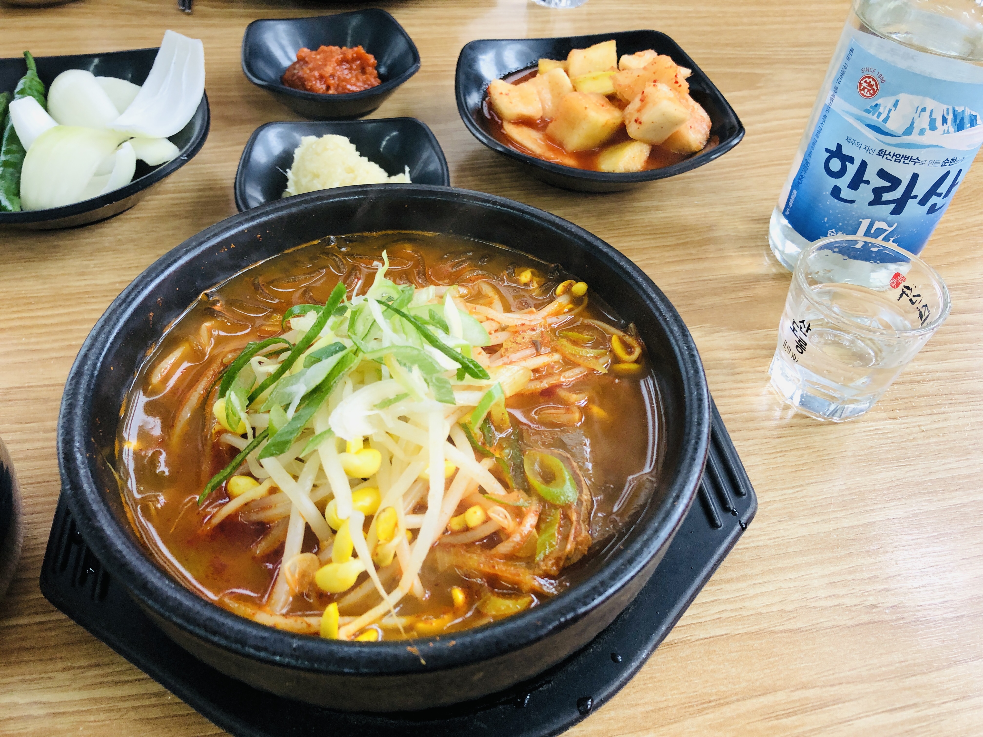아점이지만 한라산 소주를 빼놓을 수 없었다. 반찬 중에 으깬 감자로 봤던게 다진 마늘이었다. 다진 마늘 한 숟가락을 해장국에 풀어 먹으니까 시원한 맛이 배가 됐다. 국물 속에는 선지, 당면, 버섯, 고기 등 알찬 건더기가 가득했다.