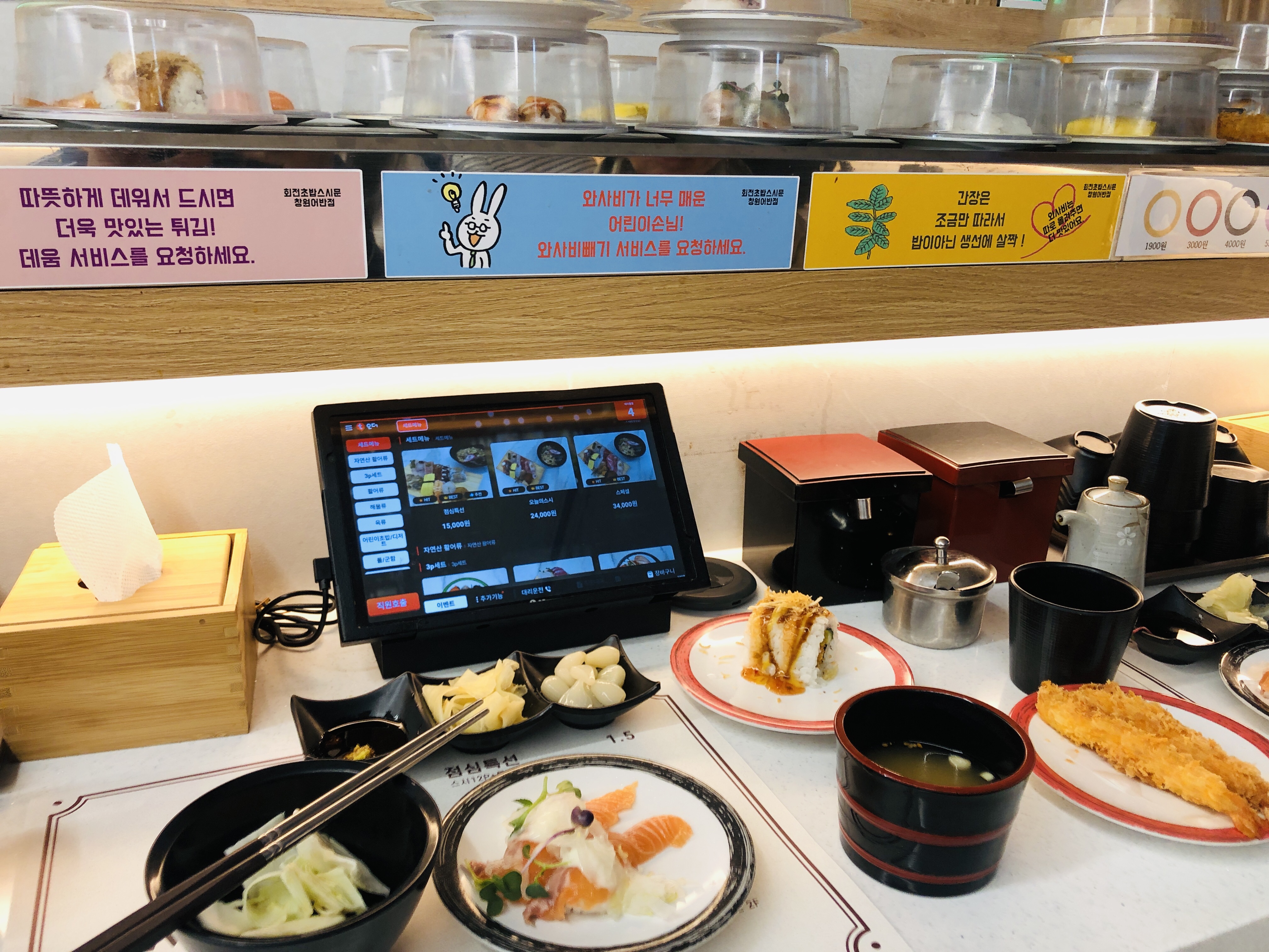 회전초밥이 먹고 싶어서 스시문 창원중동점에 갔다. 회전초밥을 직접 고르거나 모니터로 보면서 주문할 수 있어서 편했다.