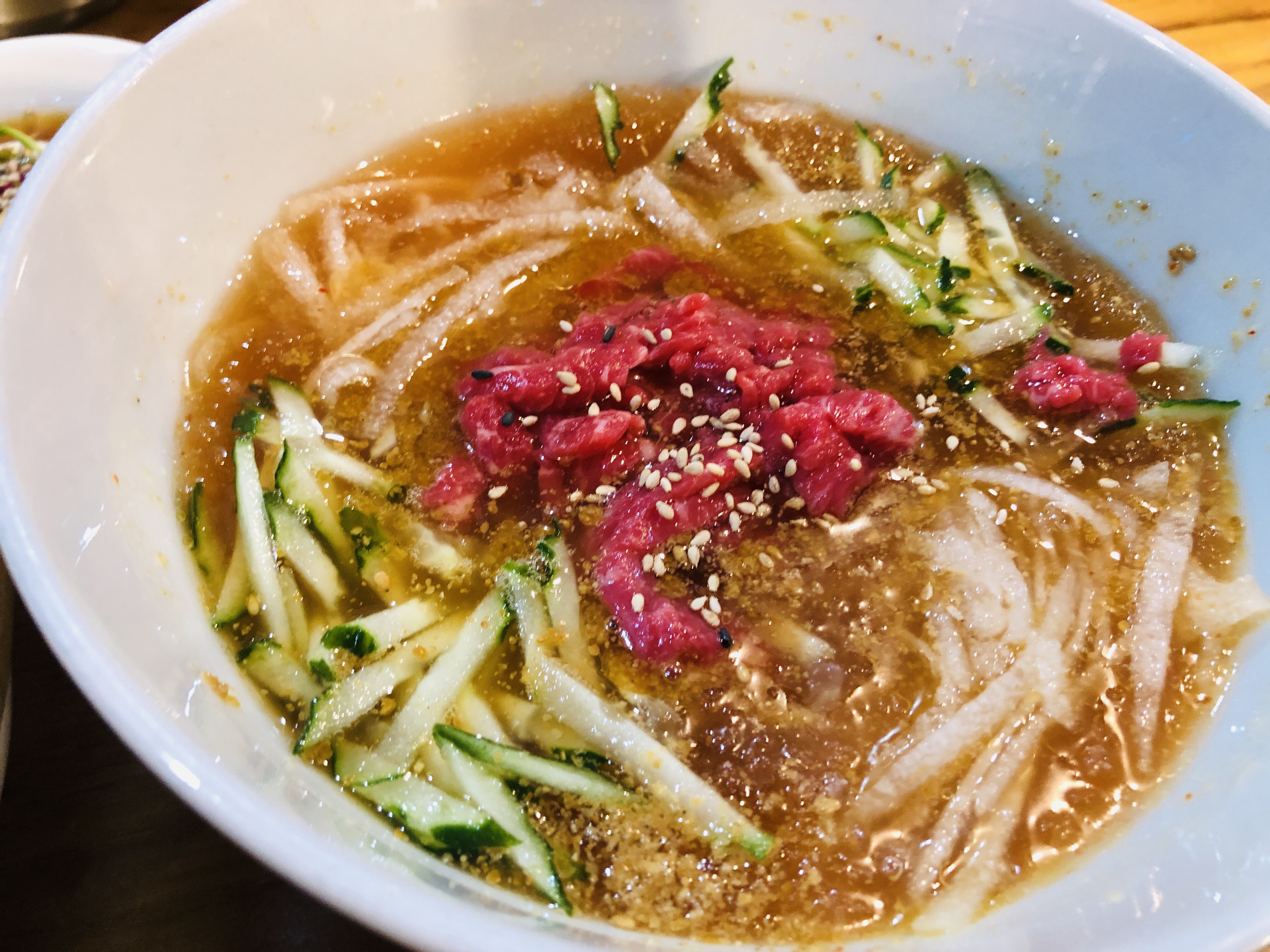 생각보다 빨리 나온 육회물회. 이래저래 시원해서 마음에 든다. 이름 그대로 육회와 물회를 넣었는데 20여 가지의 과일과 채소를 넣어서 만든 특제 물회 양념이 핵심. 어쩐지 국물이 시원하고 맛있더라.