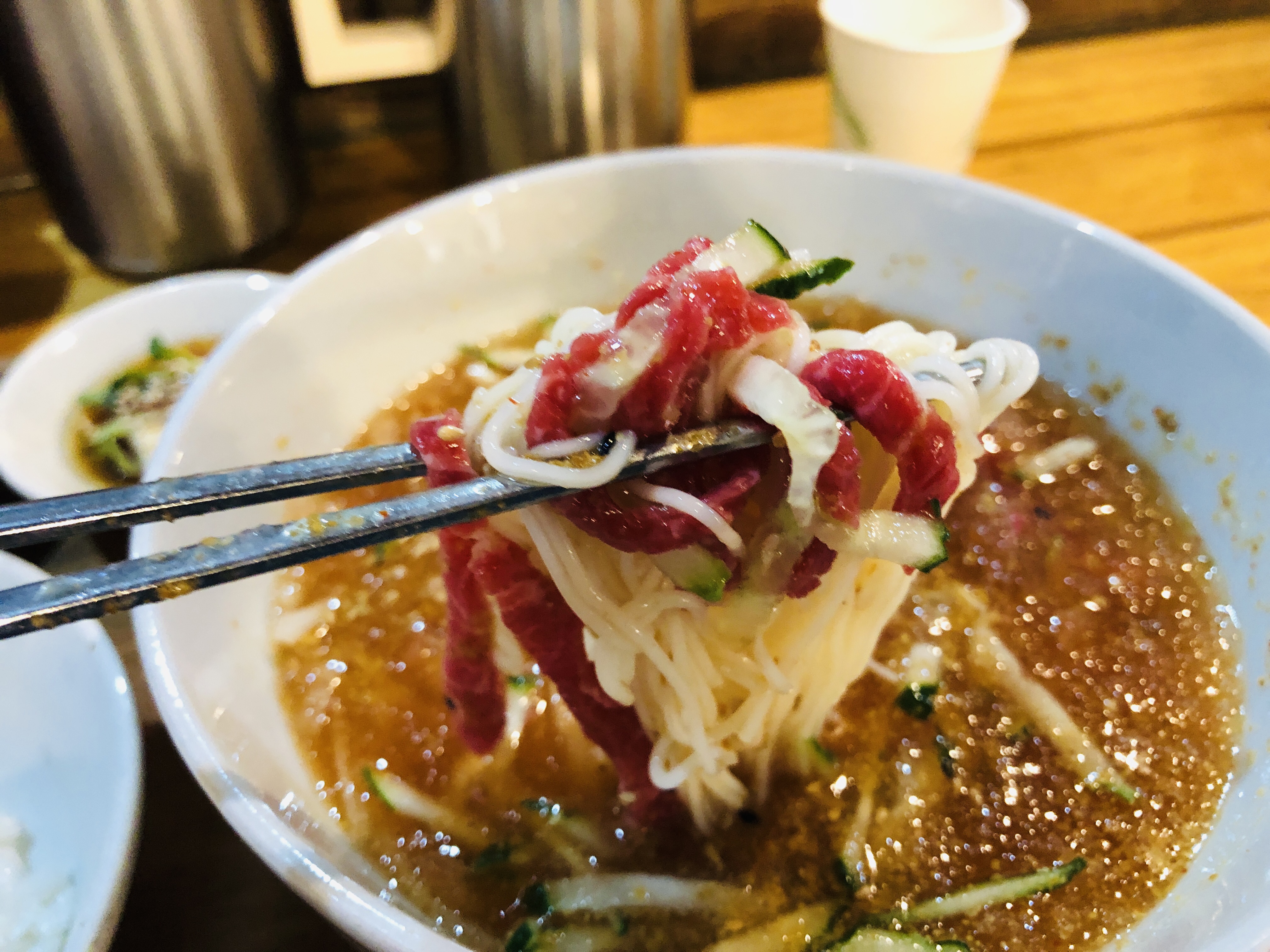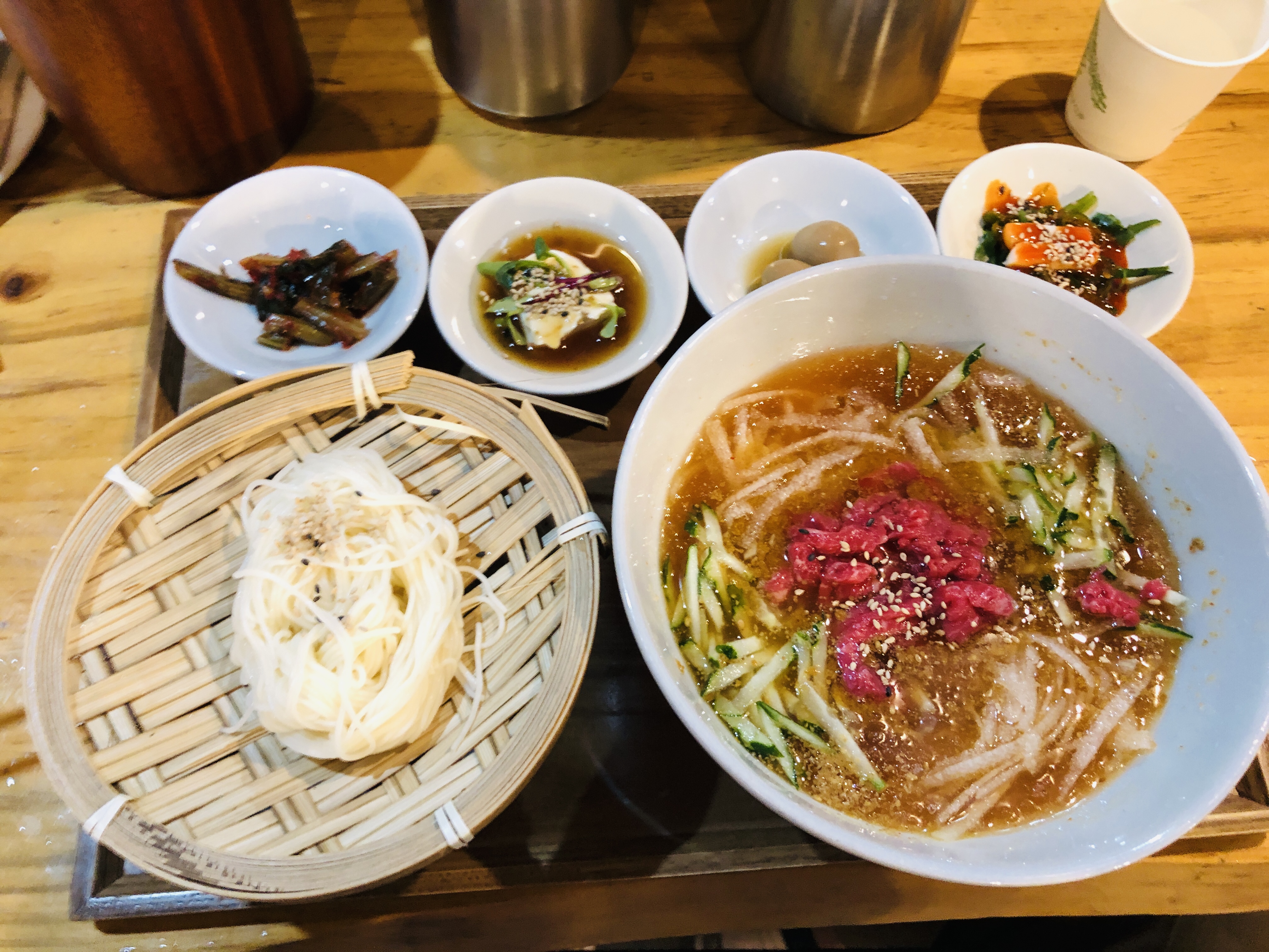 육회국수! 육회와 생선회의 양이 많지는 않으나 특제 양념을 넣은 물회 국물에 국수, 밥을 차례로 말아 먹으면 배부르다. 점식식사로는 정말 좋은 비율과 조합인 듯하다.