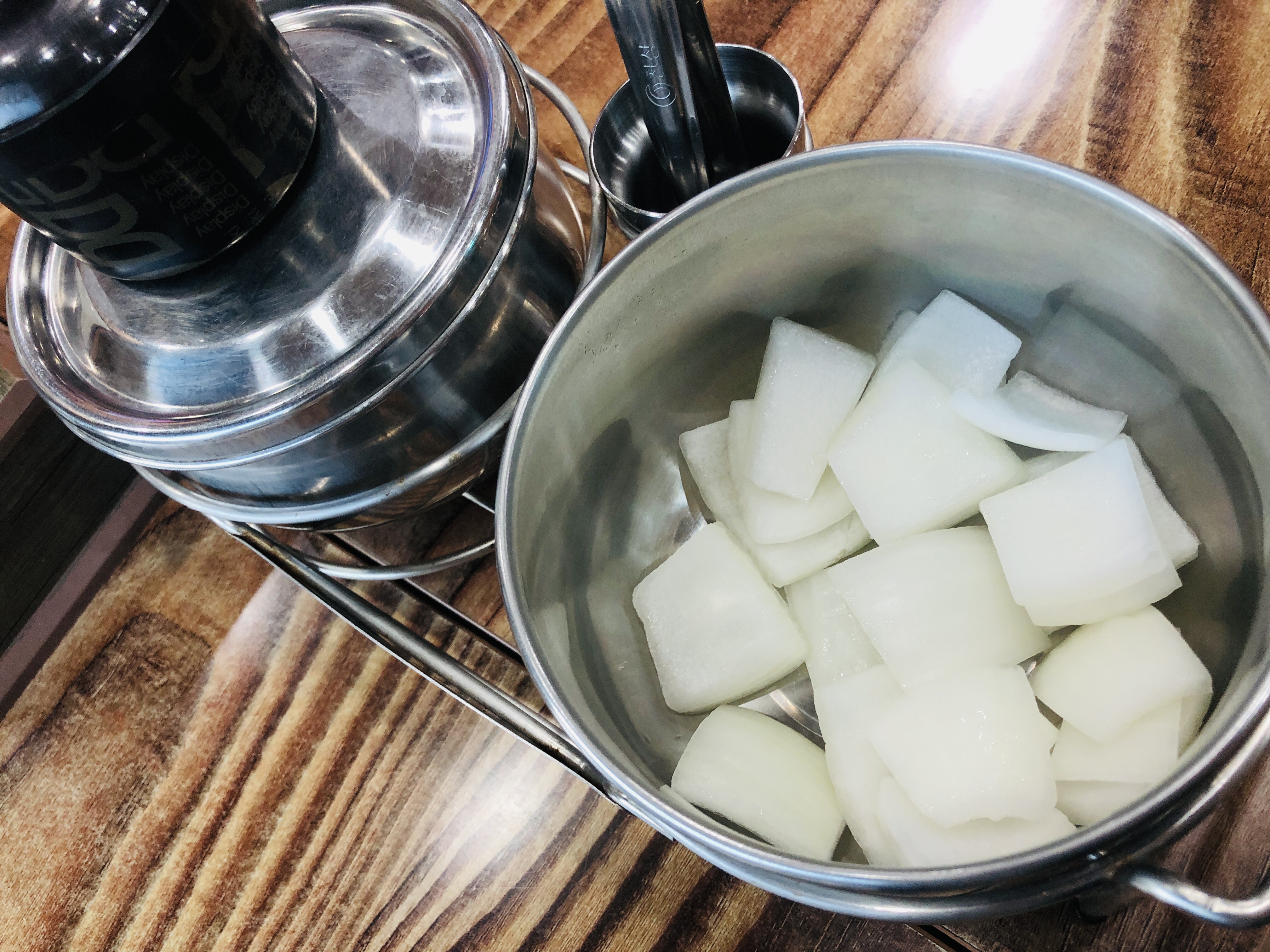 동해루는 양파와 단무지를 직접 덜어 먹는다. 식탁마다 놓여있다.