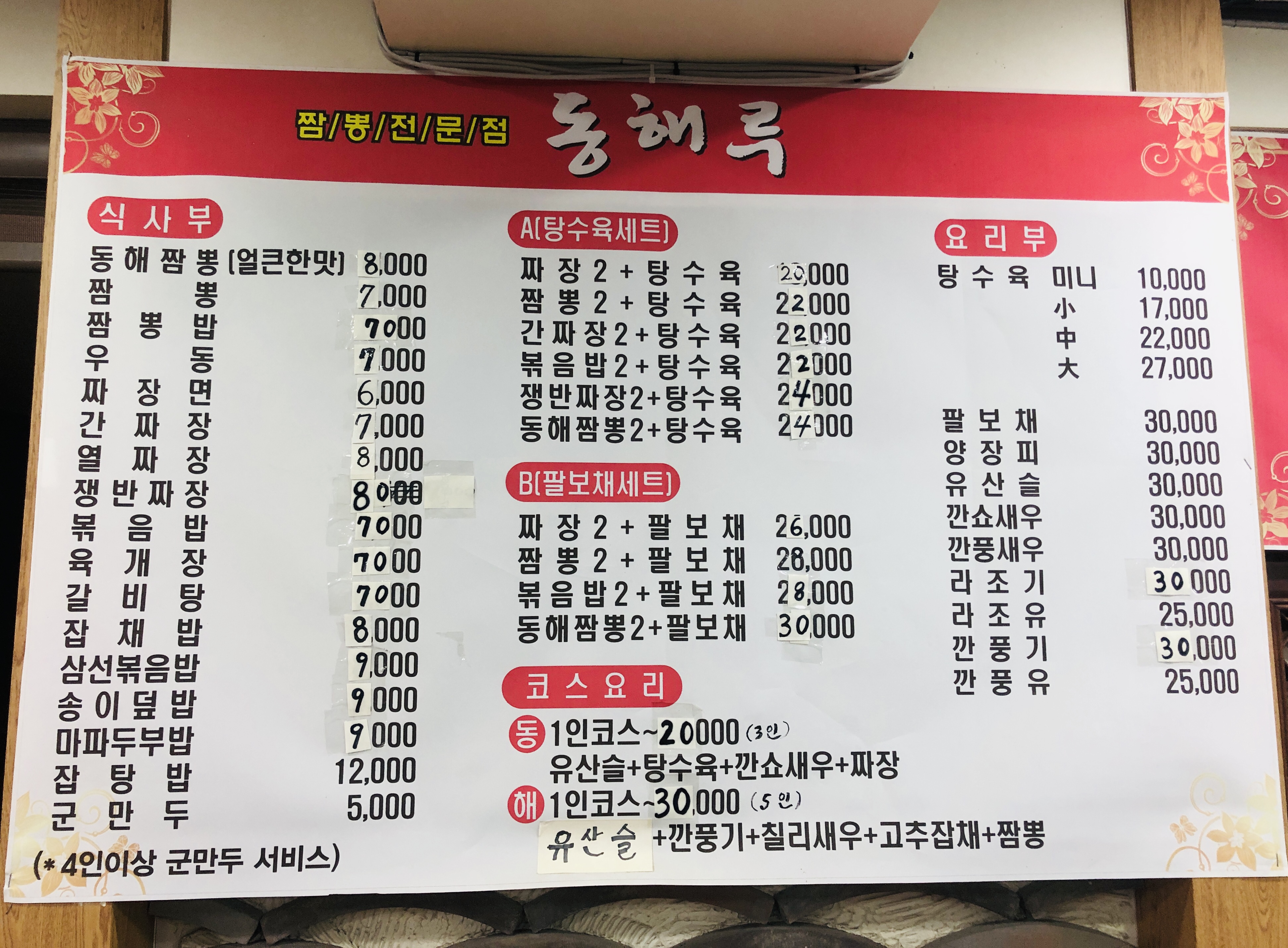 동해루는 탕수육세트와 미니탕수육이 있어서 좋다. 탕수육을 무척 좋아하기 때문. 4인 이상인 경우 군만두 서비스도 나온다. 전반적으로 가격이 착했는데 물가 상승에 따른 가격 인상이 동해루 역시 불가피했다. 뭘 먹을지 잠시 생각하다가 쟁반짜장 주문. 보통 쟁반짜장은 만이천원 이상인 경우가 많은데 동해루는 8천원이라서 혼자 먹기 괜찮았다.
