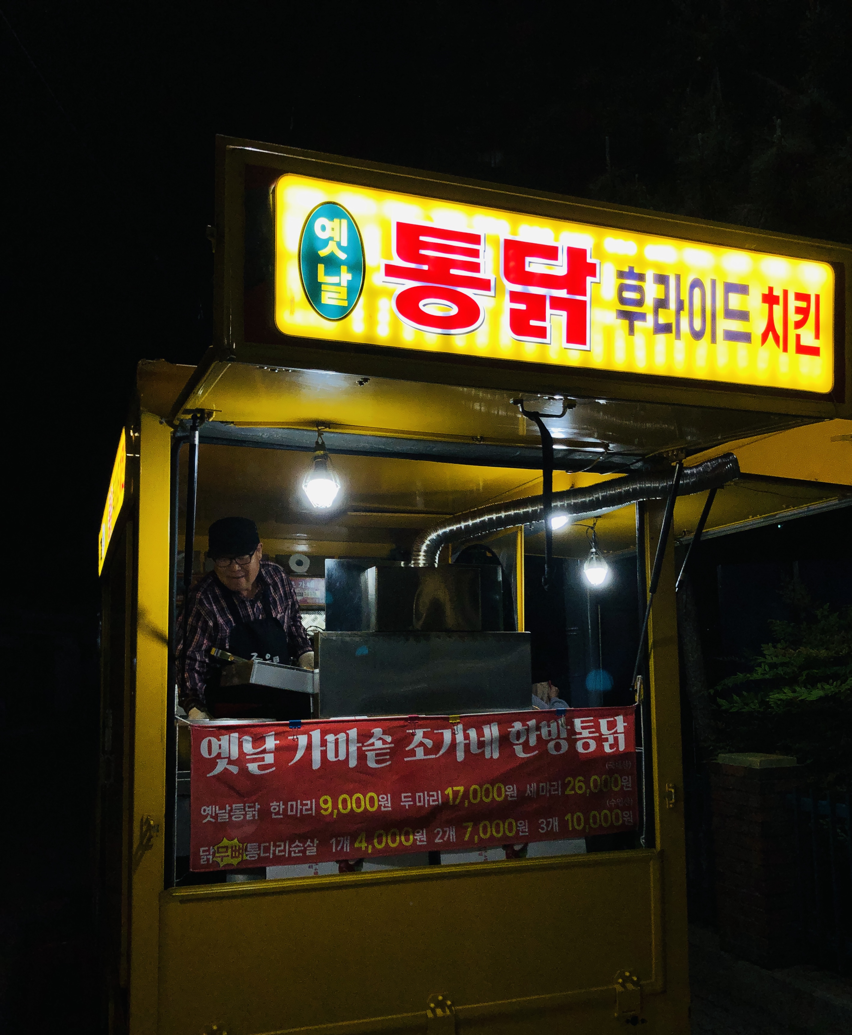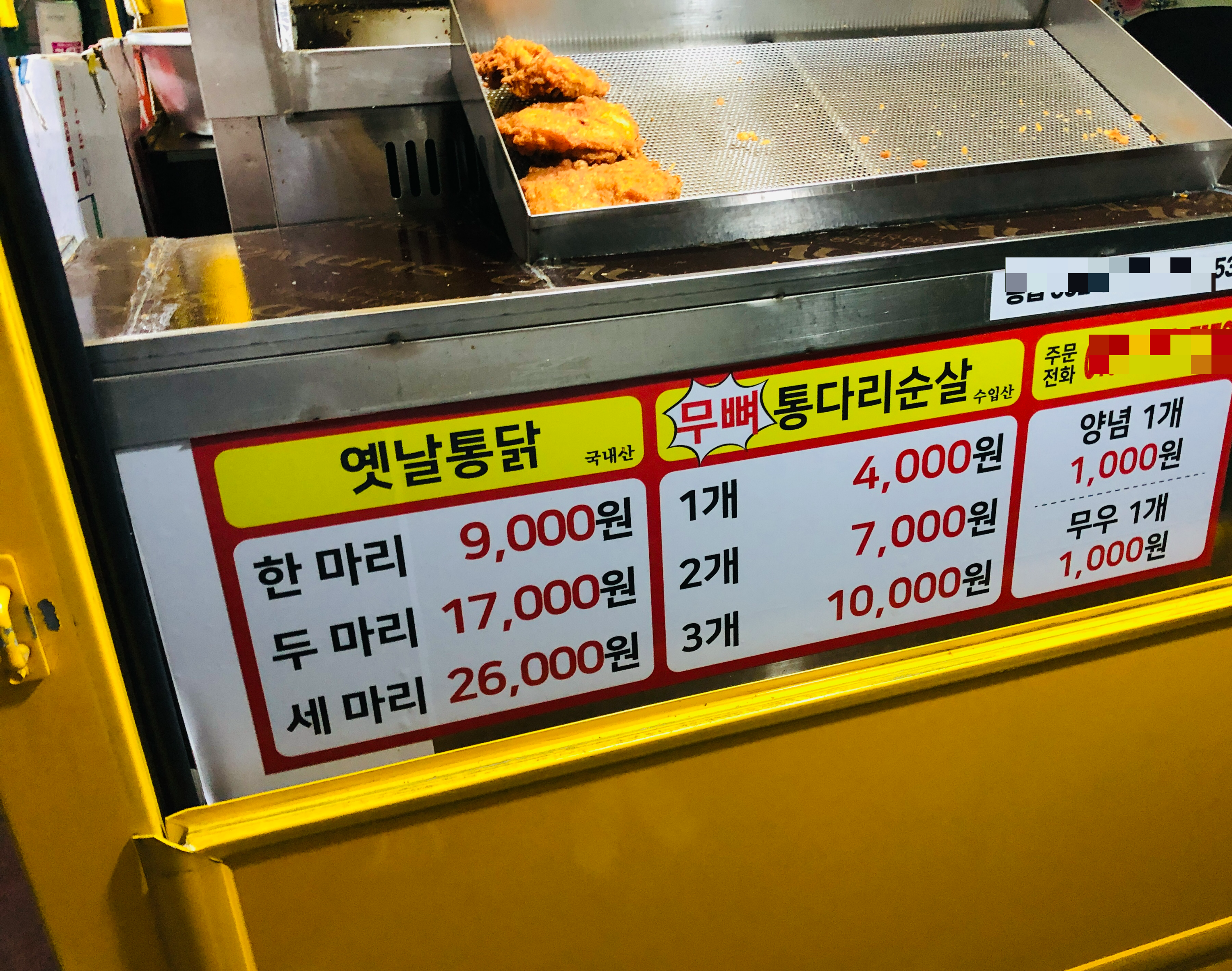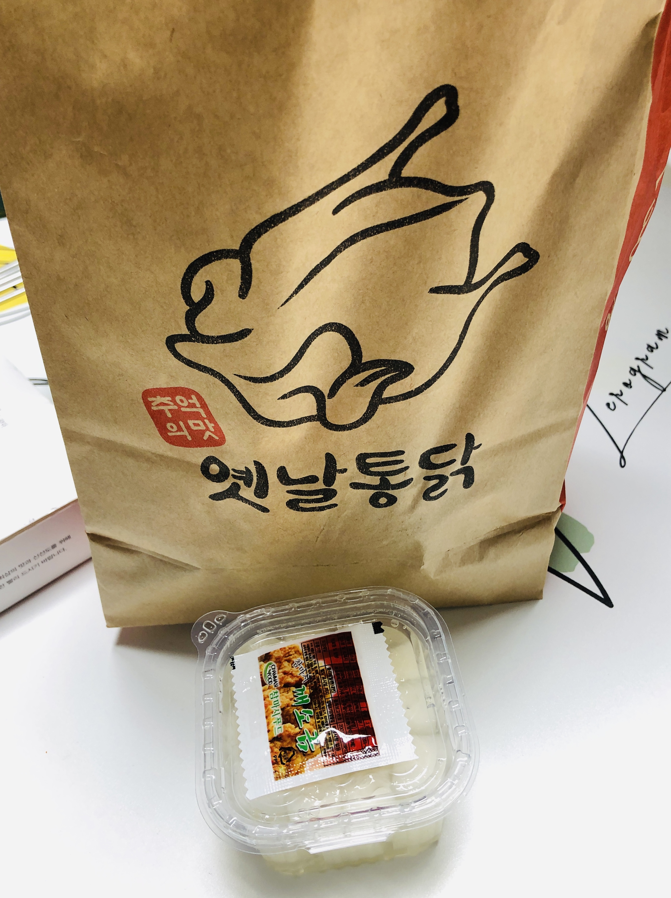 매번 그냥 지나쳤으나 드디어 사먹을 결심. 국내산 옛날통닭 두 마리 주문. 치킨무 1개 별도 구입. 양념은 안 샀는데 사면 더 다채로운 맛을 즐길 수 있다.