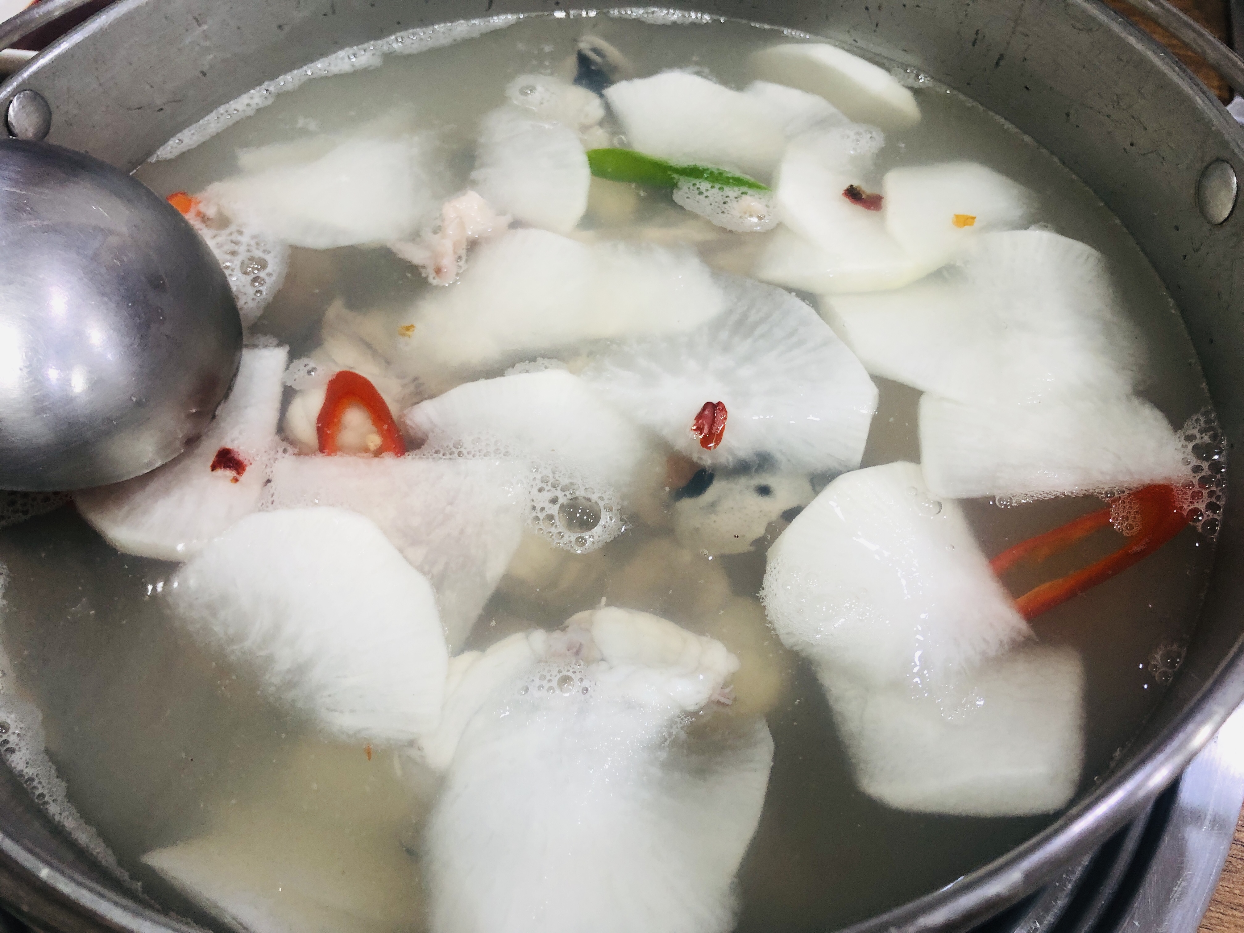 큰 냄비에 맑은 국물과 무 가득. 시원하겠다.