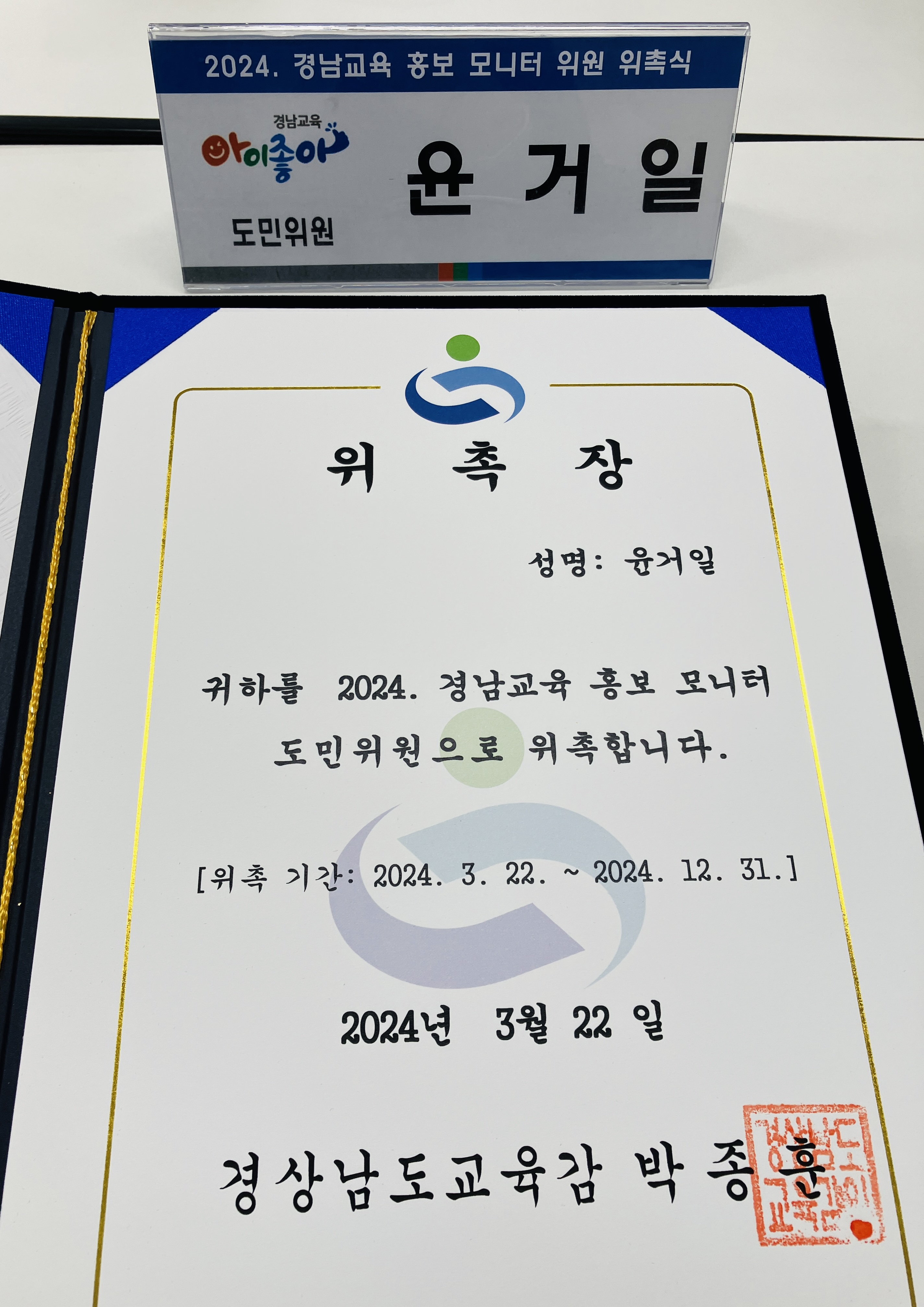 2024 경남교육 홍보 모니터 도민위원으로 위촉. 교사, 학생 그리고 학부모 위원도 있다.