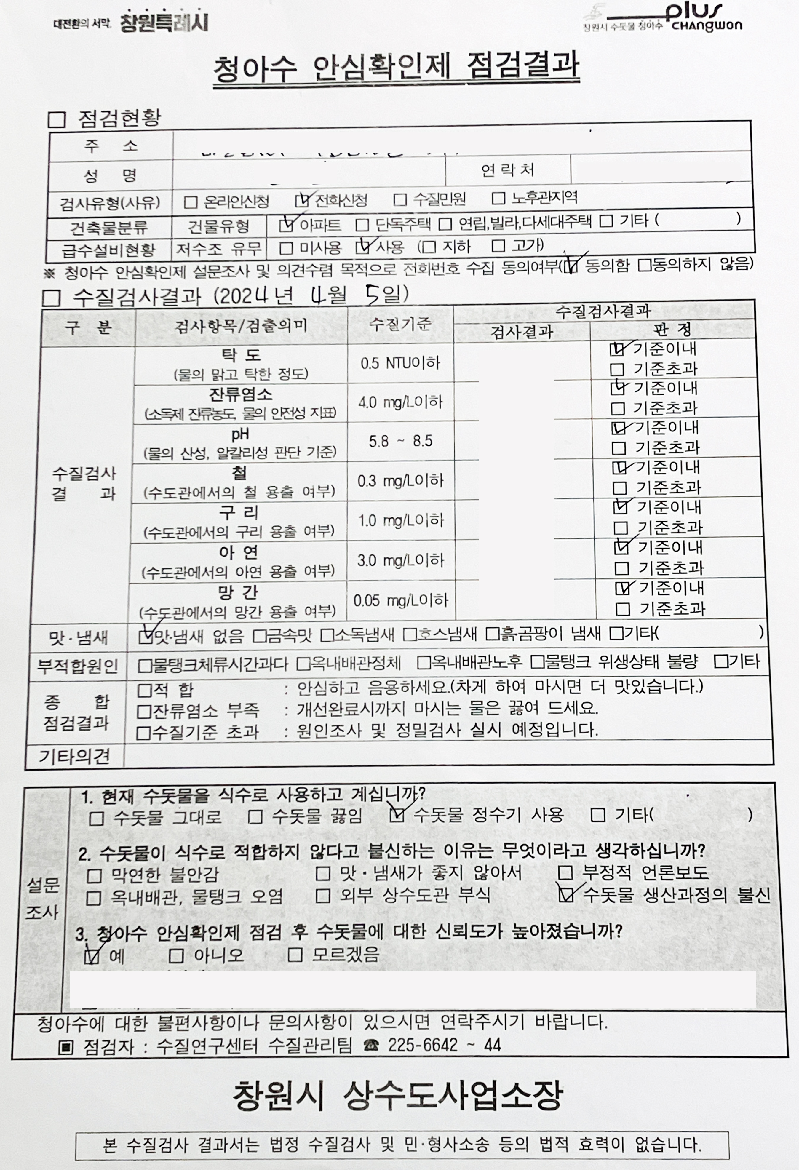 점검 결과 양호. 아파트에 살고 있는데 내심 수질이 별로라면 어쩌나 생각했는데 안심했다. 설문조사에 표시한 것처럼 평소 수돗물을 정수기를 통해 사용하고 있다. 그 이유는 수돗물 생산과정의 불신이 크다. 비단 창원뿐 아니라 모든 국가와 지역에서 말이다. 그래도 청아수 안심확인제 점검을 통해 창원특례시 수돗물에 대한 신뢰도가 높아진게 사실이다. 일단 수질검사 결과를 알 수 있고 전문가에게 궁금한 점을 물어볼 수 있기 때문이다.