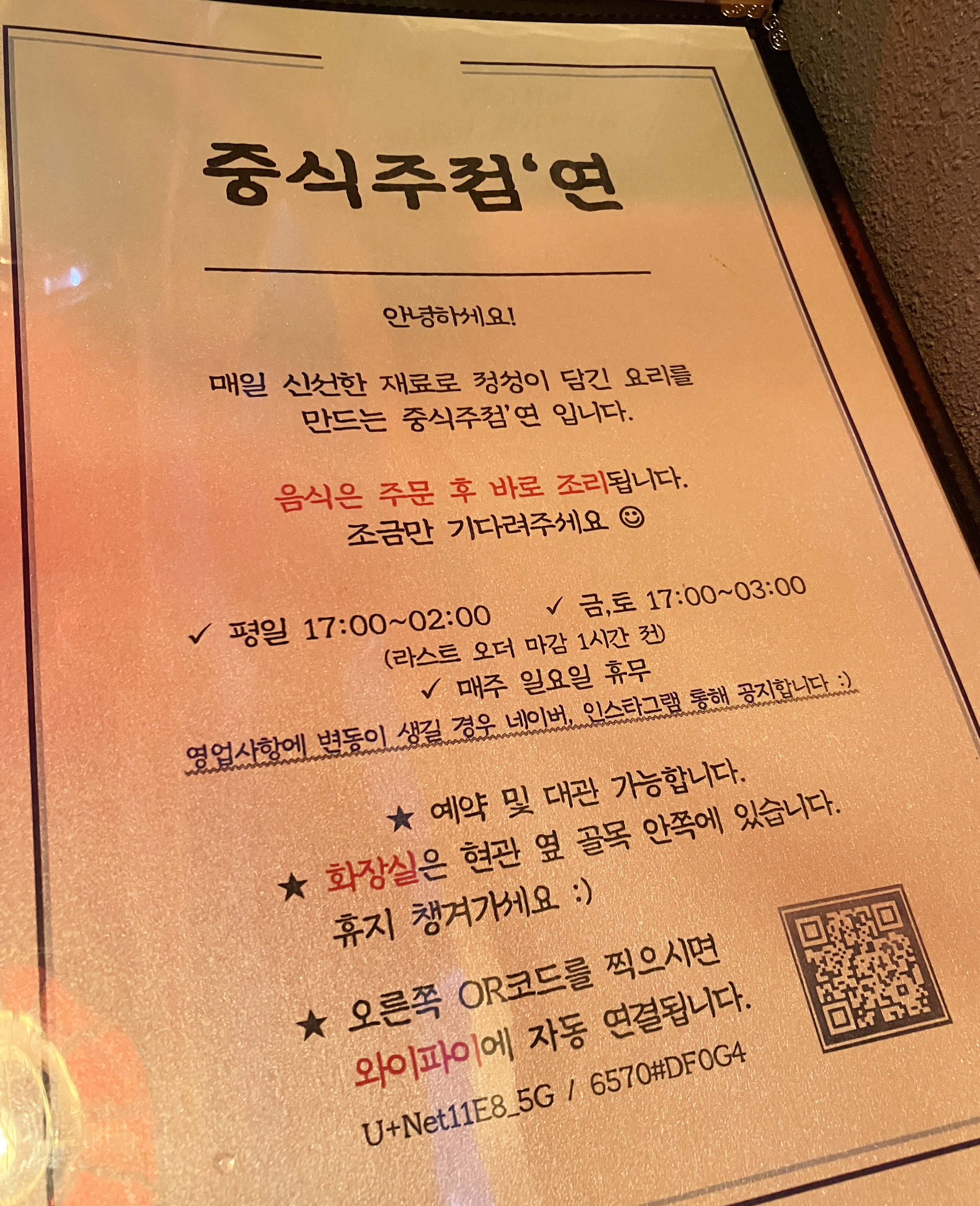 어느 날 늦게 일을 마치고 식사를 위해 우연히 들른 곳이다. 사실 짜장면과 탕수육이 먹고 싶었는데 주점이라서 탕수육 같은 요리부만 가능했다. 아쉬운대로 탕수육과 계란볶음밥을 먹었는데 신선한 충격이었다. 일단 음식이 맛있었고 1인 손님인데 친절하게 자리를 내줘서 좋았다. 이날은 다행히 유일한 2인석이 비어있어서 마음 편히 앉았다. 관계자분이 절대 눈치 주는 일은 없는데 내가 자리 차지하기 미안해서 그런다.