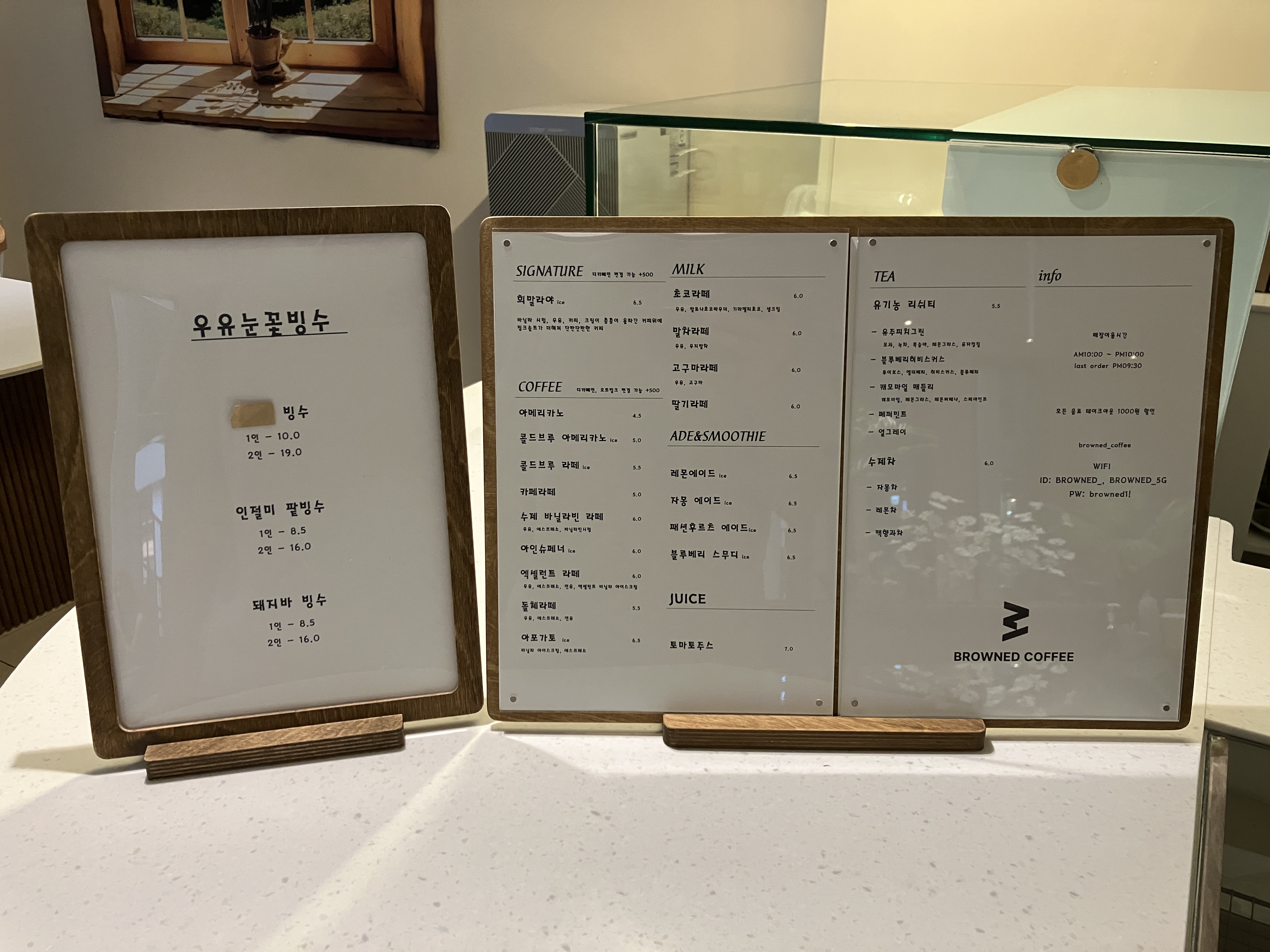 근방에서 갑자기 팥빙수가 먹고 싶어서 찾은 브라운드 커피. 일단 우유눈꽃빙수 인절미 팥빙수 주문.